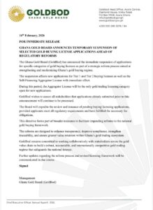 In a statement issued on Monday February 16, 2026, management of Ghana Gold Board explained that the suspension affects the issuance of certain regulatory licenses, particularly those related to gold trading activities. The move forms part of interim measures being implemented while a new operational and regulatory framework is finalised.