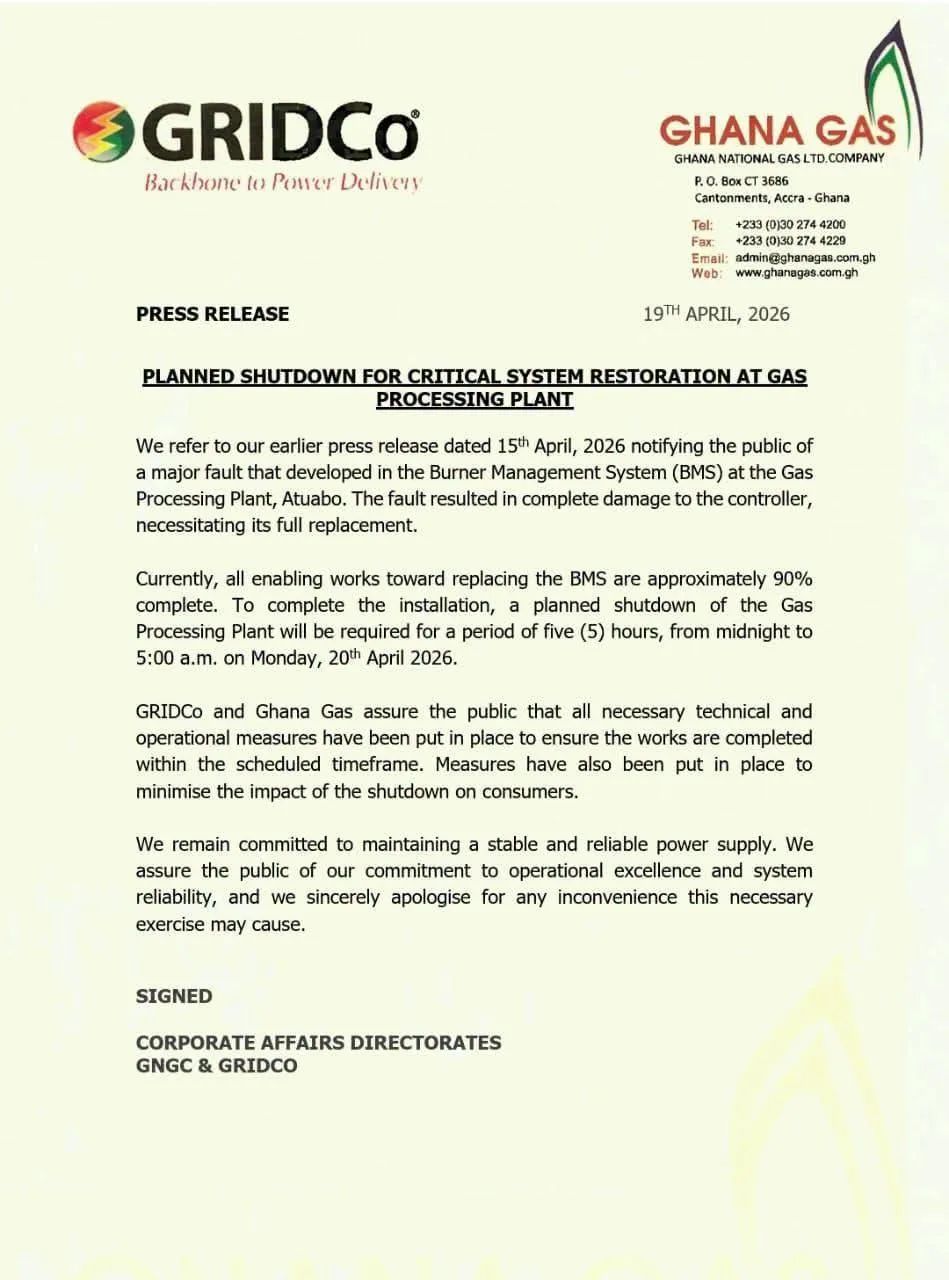 A planned early-morning shutdown of the Atuabo Gas Processing Plant has been described by the Ghana Grid Company Limited and the Ghana National Gas Company as a decisive step toward reinforcing Ghana’s power system reliability after a recent technical fault.